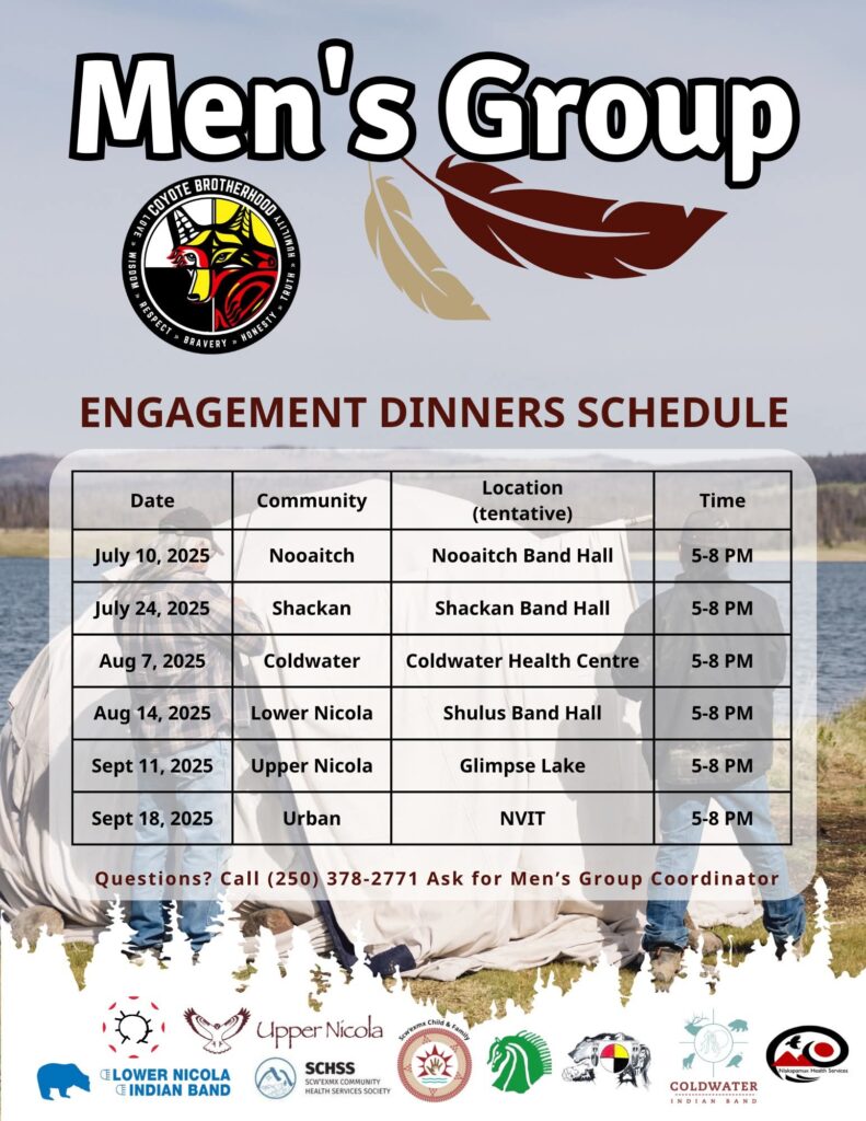 Coyote Brotherhood Men’s Group is open to all participating bands of Scw’exmx Child and Family, Citxw NIaka’pamux Assembly, Nlaka’pamux Health Services Society and Scw’exmx Community Health Services Society.